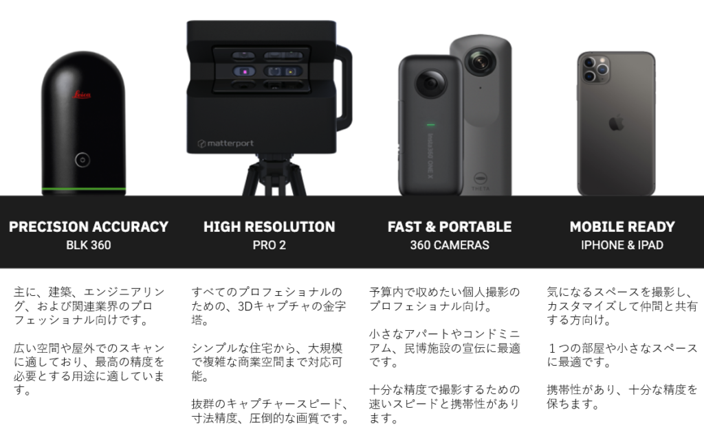 デジタルツインを作成するには、空間をスキャンするキャプチャーデバイスを選びます。 Matterportは対応するiPhoneやiPad、Leica BLK360、Matterport Pro 2カメラ、そして厳選された360カメラなど、様々なデジタルカメラに対応しており、お客様のニーズに合わせてお選びいただけます。